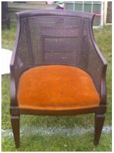 A pair of cane back chairs scored from the Brimfield Antique Show last year. I envisioned them painted white with a fun patterned fabric like this one from Angie Hranowsky's personal home: